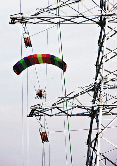 國家電網天津高壓供電公司昨日在薊縣山區八里鋪進行220千伏電源線工程建設作業,成功利用動力傘,施放架設電纜牽引導線。新華社