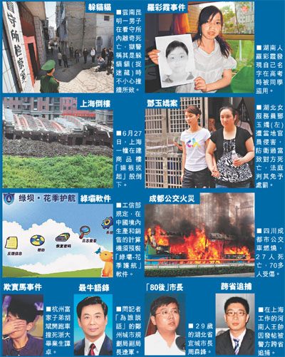 【本報珠三角新聞中心記者敖敏輝廣州3日電】近日,有網友總結出內地上半年網絡十大熱點事件,包括「躲貓貓」、「鄧玉嬌」、「羅彩霞」等事件均上榜。帖子發出後,網上跟帖不斷,不少網友們認為發帖者總結得當,基本上概括了今年上半年備受網友關注的網絡熱點新聞,並認為其中的一些事件是「網民的勝利」。