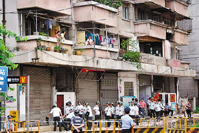 ■拆遷戶與執法人員對峙,爬上陽台威脅跳樓。本報記者敖敏輝 攝