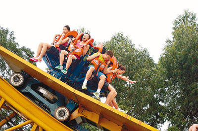 【本報訊】(記者黃佩麗番禺直擊)《當香港小姐遇上香港先生》昨日繼續在番禺長隆拍攝,候選「港姐」及「港男」下午在「歡樂世界」玩刺激機動遊戲「U形滑板」,因遇著天雨而狼狽不堪。大玩U形滑板,由於滑板離心力強勁,傳出有「斷背」情的佳麗4號劉倩婷和5號馬詠恩表現得甚慌張,只見5號馬詠恩玩到面青口唇白;3號鄭寶源試坐之後,亦怕到不敢玩,而8號熊穎詩和10號李姿敏就玩到面不改色。