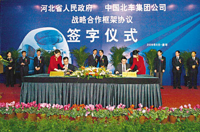 河北省政府與中國北車集團日前在中國北車唐山軌道客車公司(簡稱中國北車唐車公司)正式簽署戰略合作框架協議。雙方計劃將河北省唐山市打造成中國高速動車組研發基地和最大的生產製造基地。