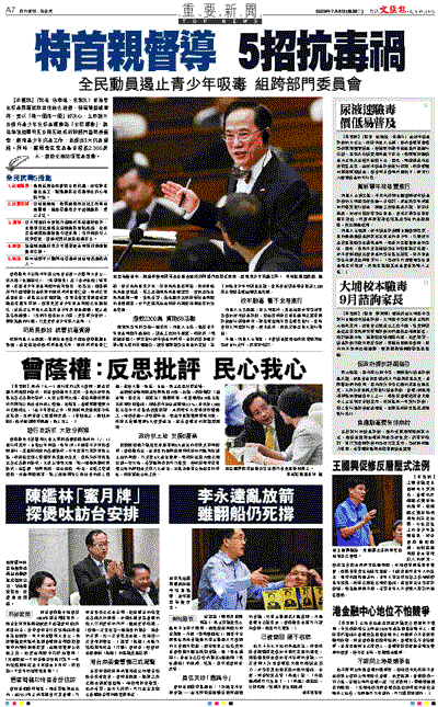 曾蔭權昨日出席本年度立法會最後一次答問大會上,多次用「急速惡化」、「殺到埋身」及「當前急務」等字眼,形容青少年吸毒問題的嚴峻情況。他指出,領導跨部門小組整體抗毒政策的律政司司長黃仁龍,早前已完成報告書,並提出70多項建議。要完全落實有關報告建議需要幾年時間,但有見於青少年吸毒問題已急速惡化,故決定立即擴大及提升青少年反吸毒運動,使之成為全民運動,「我們不但要加大力度,更要爭分奪秒,採取果斷的行動,以免更多青少年跌入毒海。」