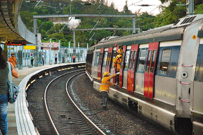 ■消防員在大學站設法將跳軌身亡男子屍體抬出。