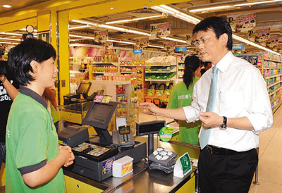 ■邱騰華昨視察筲箕灣一間超市,了解首日實施膠袋徵費的運作情況。 政府新聞處圖片