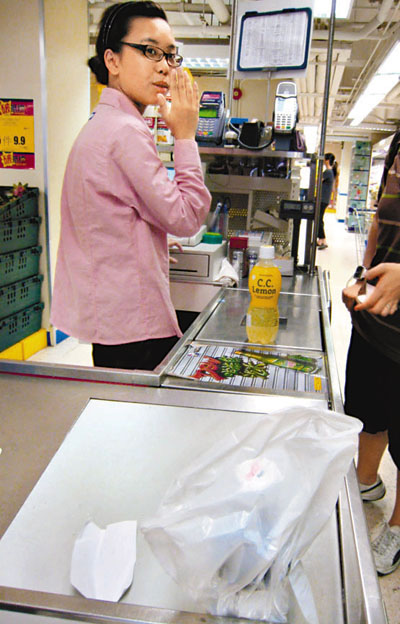 本報記者昨日在筲箕灣一間百佳超級市場,購買支裝汽水後前往繳費,收銀員詢問是否需要膠袋,記者以膠袋需要徵費拒絕,職員即時從收銀處旁數十個無手挽膠袋中取出一個,讓記者盛載汽水。隨後的一位顧客見狀,向其索取3個無手挽免費膠袋,職員亦如數給予。