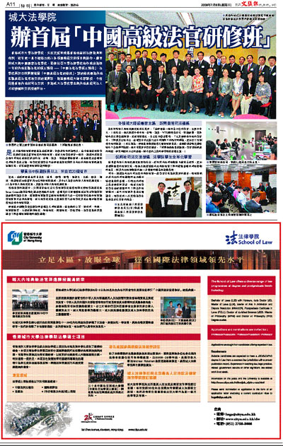 香港城市大學法律學院,矢志支援和推進香港地區的法律教育和培訓,近年更一直不遺餘力推行各項國際級交流項目與協作。繼早前城大與中國國家法官學院、哥倫比亞大學法律學院合作推出為期一年的內地在職法官的碩士課程 —「中國法官法學碩士課程」,法學院再於日前開辦首屆「中國高級法官研修班」。該研修班專為內地在職高級法官來港交流研習開設,邀請國際級大師名家講授,不僅促進香港內地的司法交流,亦為城大法學院學生與內地高級司法人才的接觸和交流搭建平台。