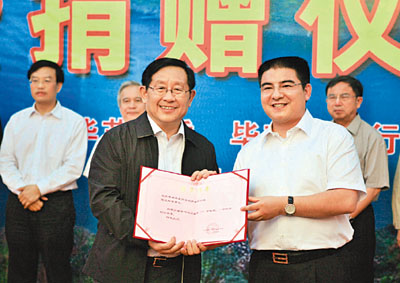 全國政協副主席、科技部部長、致公黨中央主席萬鋼為陳光標頒發榮譽證書。