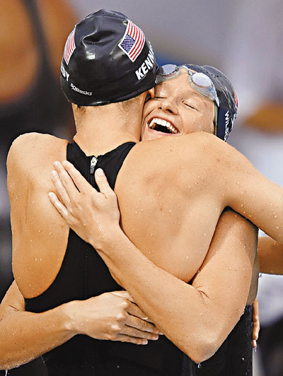 ■韋漢娜(右)在比賽後接受祝賀。新華社