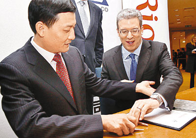 ■「間諜門」爆發前一月,剛剛爆出力拓毀約,拒絕中鋁195億美元注資的消息。圖為雙方當初簽約時的情景。