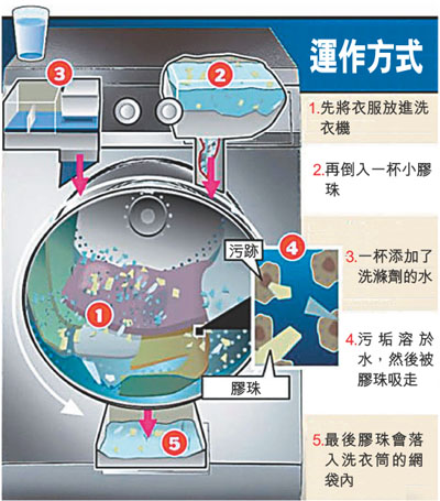 使用環保洗衣機時,只需加入少許清水和洗衣粉把衣服弄濕,令污跡鬆散,同時產生水氣,使小珠發揮效用。衣服洗完後,小珠會落在洗衣筒的網袋內,可供循環再用約100次。