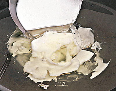 2用慢火燒油起鑊,分幾次倒入蛋白,待蛋白開始轉成白色,才略翻攪,略凝固,盛起隔油,備用;