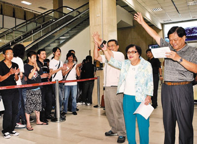 范振宗、許榮淑19日中午自大陸返台,當兩人步進入境大廳,立即響起熱烈掌聲、歡呼聲,民進黨三重市黨部主委鍾鎮宇帶頭高呼,「用最熱烈的掌聲,歡迎我們台灣阿嬤,許榮淑!」包括前民進黨籍立委曹來旺、前台聯立委陳銀河等人也到場接機,現場也有民眾拉起「重建黨魂,公平對待,對抗中國,制定政策」布條。