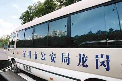 ■深圳警方昨用窗戶貼上黑色反光紙的小巴或7人車,分批送走獲釋者,令記者難以追訪有關人士。 本報記者梁祖彝 攝