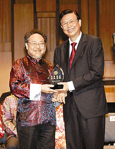 梁淦基(右)致送紀念品予新聲國樂團音樂總監邱少彬。本報記者劉國權 攝