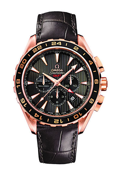 歐米茄的海馬系列一向以海洋為靈感,最新的Aqua Terra GMT同軸計時錶,除了原有的運動風格及多功能外,款式外形也下了不少心思。錶面的飾紋,參考自甲板錶面上的垂直紋理,以灰色作為甲板色,並有從中央向外散射的太陽射線效果,顯得紋理分外分明,令人聯想起豪華遊艇上優哉游哉的感覺。而錶面上設有3個黑色小錶盤,有時針、分針、GMT指針及計時大秒針的功能。內裡選用歐米茄獨有的同軸3603機芯,確保長期性能超卓,並獲瑞士官方天文台錶證書。