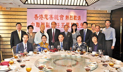 ■香港慈善總會主席鄭蘇薇,該會榮譽會長盧文端,副會長何鐵文,陸順海,黃華康,吳漢良,李國華,鄺自讓夫婦,李福生,陳博智,香港文匯報副社長韓力等歡聚一堂餞別王鳳超。