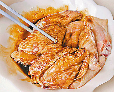 1. 雞翼以生抽、老抽、蜂蜜、生粉及麻油各少許醃三十分鐘,備用;子薑切片,以白醋及蜂蜜各半杯,煮約二十分鐘,用冷水洗淨,吸乾水份,備用;
