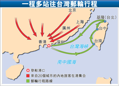 他又指出,赴港澳個人遊政策已推出6年,發展成熟,內地部門可在3至7天處理簽證申請。他認為,台灣是內地旅客新興的旅遊熱點,配合郵輪的新元素,具一定吸引力,相信旅行社及有關部門了解政策後,簽證將漸趨便捷。