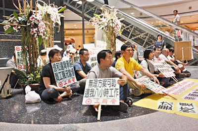 工聯會昨日聯同20名領匯將軍澳商場外判保安員到領匯將軍澳尚德商場示威,抗議領匯出爾反爾,令100名外判保安員失業。工聯會領匯外判權益關注組召集人葉偉明表示,領匯將軍澳商場保安外判商上周三曾承諾,會於8月15日前為早前離職的保安員提供就業機會,聘請他們繼續在將軍澳區內的商場工作,但領匯其後提出3項不合理復職條件,要求保安員「三選一」,包括申請職位較高的保安主管職位;申請擔任流動保安員,雖為三更制,但每天工作地點不定,第三個方案是申請兩更制(12小時)崗位。