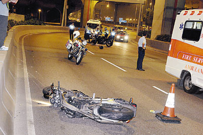 【本報訊】港島西區發生電單車嚴重交通意外!一對菲律賓籍兄弟,分別駕駛電單車駛至干諾道西近東邊街時,兄長的電單車失控撞壆,當場人仰車翻,頭部重創倒地昏迷。其弟駕掛上「P」牌電單車尾隨到達,停車將重傷兄長抱上一輛的士送院,途中遇上救護車轉送醫院救治,傷勢垂危。傷者弟折返現場協助警方調查,因酒精測試超標被捕扣查。