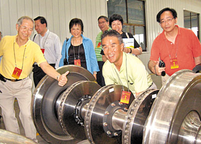 ■田北辰嘗試移動鐵路使用的車輪,王如登、葉國謙等在旁打氣。