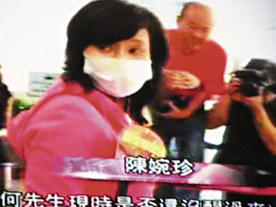 昨日上午八時多,一身粉紅色運動裝的三太陳婉珍乘座架抵達醫院,逗留至中午才離開,戴著口罩的三太步出醫院時,被問到賭王是否清醒?她輕鬆地說:「佢醒驉C(是否中風?)不是。」當記者追問賭王是否跌傷後腦時,三太即不發一言上車離開。