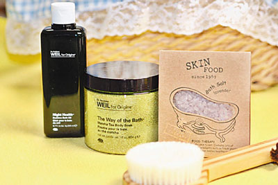 ■(圖左起)Origins Dr. Weil系列的酣睡沐浴油 $320、抹茶身體浸浴粉 $400、Skinfood 薰衣草浴鹽 $40。