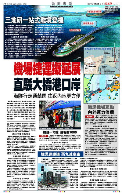 港珠澳大橋工程於今年底上馬,港府近日亦將有關項目逐一刊憲。據悉,港府構思把香港機場的旅客捷運系統延伸約一公里至港珠澳大橋的香港口岸,其中300米會以沉箱方式的海底隧道興建,主要是配合現有捷運管道距離地面約10米的深度,以及港深機場鐵路擬設於香港口岸的地底車站。在新安排下,日後途經香港口岸往返內地的旅客,將可集中在地底轉乘捷運系統來往香港機場禁區。