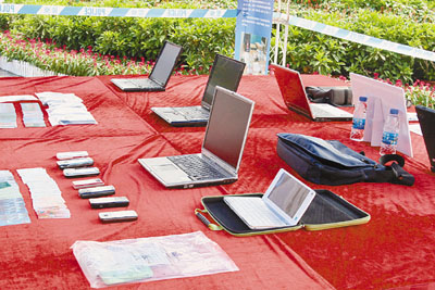 ■圖為警方繳獲的電話詐騙作案工具。本報記者敖敏輝 攝