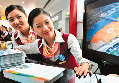 ■「城市,讓生活更美好」是上海辦博理念。圖為浦東國際機場職員向遊客展露微笑。明年上海世博會期間,預計將有7000萬人次參觀。