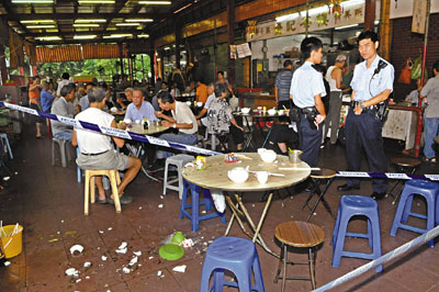 2名傷者未及反應,周已衝前將2人所坐檯椅翻轉,其他茶客一陣哄動,爭相走避,職員報警求助。警員到場發現周呆站舖內,未有逃走,警員遂上前將他拘捕帶署,並召救護車將2名傷者送院,期間,未有離去茶客見場面受到控制,即若無其事繼續如常嘆茶。
