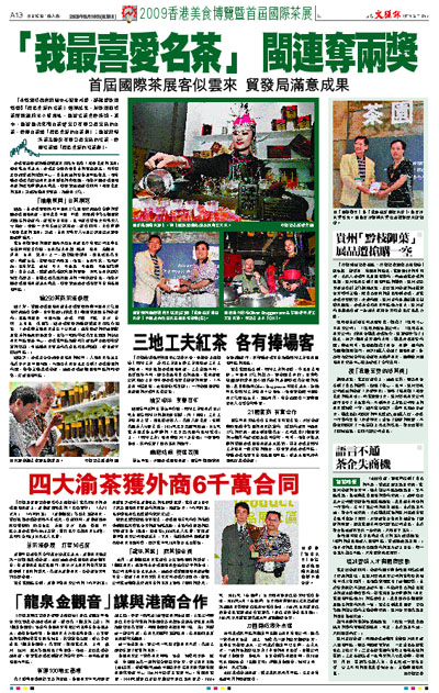 據悉,由香港貿發局和中國茶文化國際交流協會合辦的首屆香港國際茶展,吸引來自中國、印度、斯里蘭卡等15個國家和地區的參展商,展覽昨日閉幕,其中展會首兩天向專業人士開放,最後一天向普通公眾開放。展會期間,大會舉辦「我最喜愛的名茶」評選,由茶業專業人士及公眾投票決定最後選舉結果。