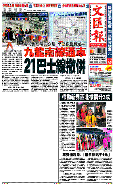 【本報訊】(記者 譚靜雯)港鐵九龍南線昨日通車,從此東、西鐵線將以紅磡為終點站。東、西鐵互通後,逾百萬名新界西北居民到市區的淨車程少於38分鐘,較現時的路面交通工具節省近半小時車程。惟因應巴士乘客量或流失至鐵路,運輸署擬逐步取消、合併或調整21條專營巴士路線。有區議員推算,單是削減3條巴士路線,預料最少4萬人受影響;小巴業界則估計,小巴將流失50%乘客量。