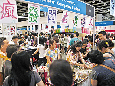 ■不少參展商昨日更再次劈價,海嘯價、大清貨標語隨處可見。 本報記者嚴敏慧 攝