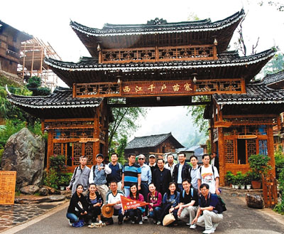 ■「海學聯」代表團在西江千戶苗寨前合影。