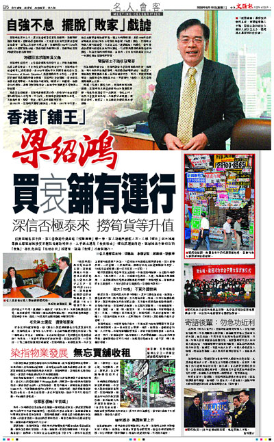 投資策略各有不同,有人喜歡趁升勢高追「搭順風車」賺一筆,有人卻專門撈底入市。人稱「舖王」的大鴻輝集團主席梁紹鴻接受本報記者專訪時表示,上手業主越是「衰到貼地」,舖位就越買得過。梁紹鴻並不害怕沾染「衰氣」,相反他深信「否極泰來」的道理,認為「衰舖」才最有運行。