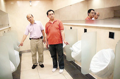 ■葉偉明指出,將軍澳部分商場內的廁所尿兜淤塞不能使用。 本報記者聶曉輝 攝