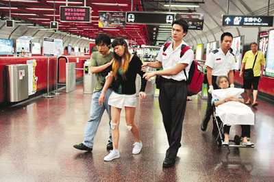 【本報訊】港鐵太古站前晚深夜發生扶手電梯意外。一個三代同堂家庭,晚膳後於11時20分乘地鐵回家,一行8人使用上行往康山出口的扶手電梯時,疑扶手電梯遭一個硬幣「卡」住而運行不暢順,導致走在前面的老婦失平衡後仰致發生骨牌效應,令殿後2名成年男女家屬亦告跌傷,意外驚動港鐵職員,召救護車將他們送院治理。