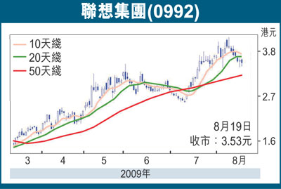 聯想較早前公布首季業績,虧損收窄至1,600萬美元,較市場預期的5,400萬美元明顯優勝。集團在今年4-6月份的個人電腦銷量按年增1.1%,表現優於全球個人電腦整體市場銷量的3.3%降幅;而其在全球個人電腦的市場份額亦上升0.4個百分點至8.6%,創併購以來的新高。據了解,內地全力刺激內需,並加大「家電入鄉」的力度,都成為推動聯想業績得以改善的動力。聯想近期由高位的4.15元水平回落,中短期博反彈也以此水位為回升目標。
