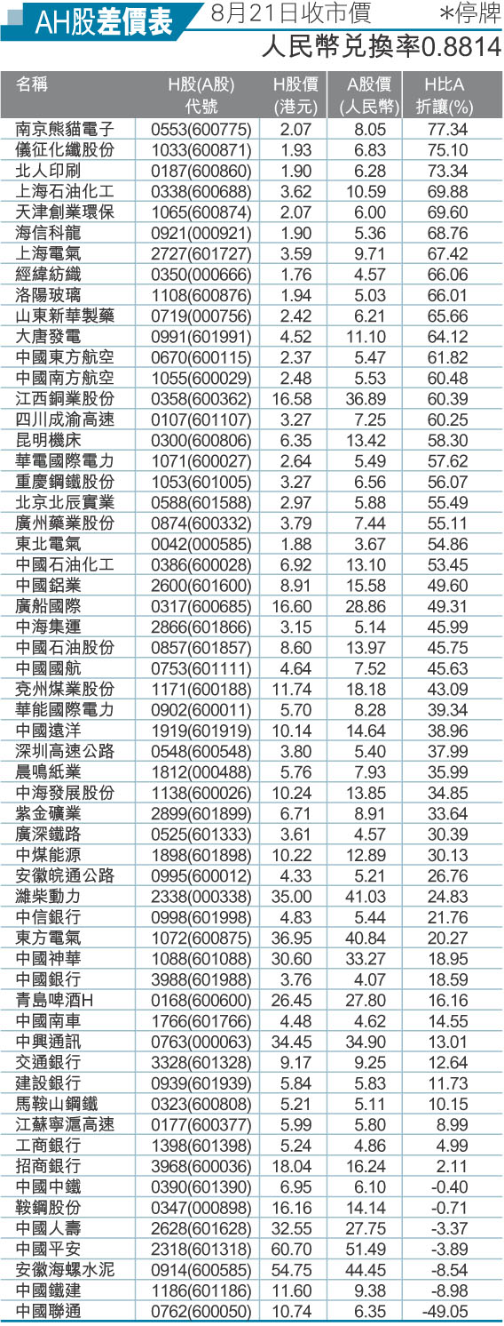 AH股差價表 8月21日收市價 (2009-08-22) (圖)
