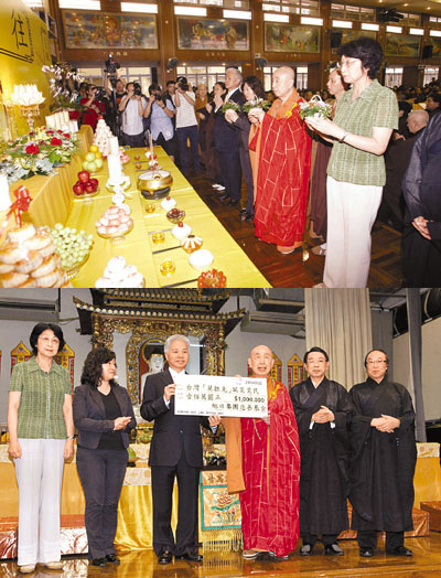 ■(上圖)覺光長老親自主法,帶領眾人超度風災亡靈。(下圖)楊釗居士捐出100萬元賑災。 本報記者劉國權 攝