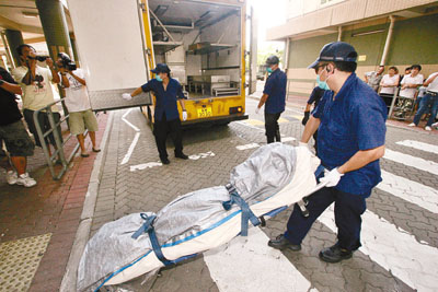 ■大孖的屍體由仵工舁送殮房等候法醫進一步剖驗死因。 本報記者蔣焯文 攝