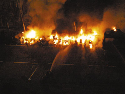【本報訊】葵涌石籬h昨凌晨發生「串燒電單車」縱火案,20輛緊貼停泊路邊的電單車群,其中一輛突著火並迅速蔓延,期間發生油缸連環爆炸,20輛電單車齊陷火海,猶如一串火龍,旁邊一輛旅遊巴亦被波及焚毀,消防員需開動水喉及噴射化學泡沫始將火撲熄,警方列作縱火案處理。