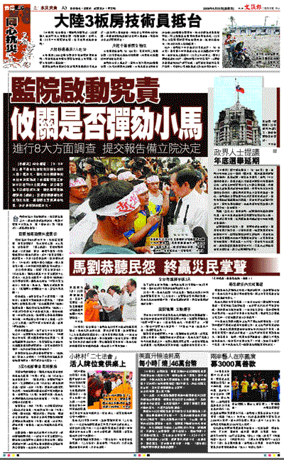 【本報訊】綜合報道:「8.8水災」是不是扯出官僚救災慢半拍的人禍?馬英九、劉兆玄在關鍵時刻有沒有決策錯誤?台灣監察院正針對水災進行8大方面調查,部分監委私下已經形成共識,雖然監察院無權彈劾「總統」,但這份關鍵報告將送到立法院,讓朝野立委視調查結果,決定是否彈劾馬英九。