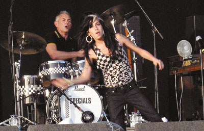 最近經常和友儕們觀賞板球的英國女歌手Lily Allen,繼毫不吝嗇穿起透視裝任人看胸前兩點後,她再以奇裝異服吸引人眼球,實行憑自己名氣提高外界對這運動的注目度。這回Lily不再性感示人,改為頭戴啤酒杯狀裝飾(上圖),相信任何人望見都會多看兩眼。另外,前天她亦置身音樂節V Festival,同場還有積極謀求復出的Amy Winehouse(下圖),有指「毒后」是以去年的舊衫上台,到底這是環保不浪費抑或刻意想讓人發現她穿舊衣,繼而給機會人家寫文章?■文:莫問/圖:網上圖片、綜合外電消息