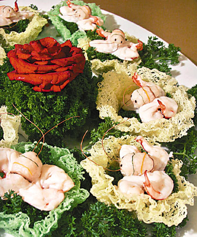 賣相精緻的蝴蝶蝦用上1斤只有9隻的麻蝦,去蝦頭後切成蝴蝶狀,再加上蝦肉製成的蝴蝶身,工序繁複。$388/10隻(a)