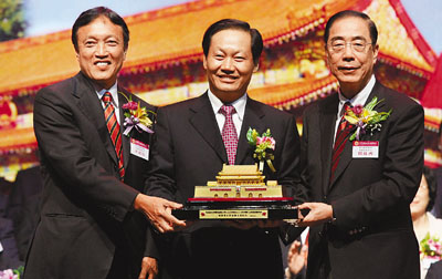 彭清華(中)接受永遠名譽會長楊孫西和洪祖杭致送紀念品。