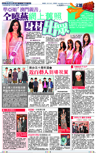【本報訊】(記者 黃佩麗)10位應屆港澳特區賽區的亞洲小姐候選佳麗,昨日出席「澳門親善之旅記者會」,並穿上大會安排的服裝作自我介紹,擁有標青外表的2號「翻版李嘉欣」王希瑤、7號「翻版關芝琳」仝曉燕及由榮雪梅提名的3號莫曉菲都成功入圍,面試時未曾見過的4號魏萱嬅則自稱左眼發炎,所以全程以墨鏡示人。