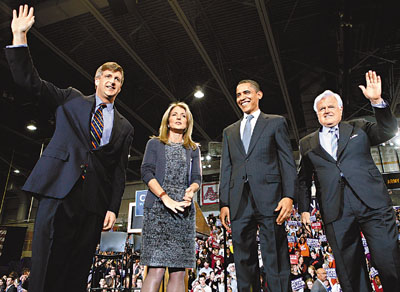 ■愛德華(右)與兒子小愛德華(左)及姪女卡羅琳去年1月為奧巴馬站台。 法新社