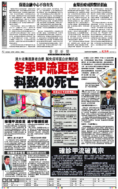 【本報訊】(記者 譚靜雯)甲型H1N1流感疫潮持續,冬季更是高危期。香港大學指出,冬季流感病毒更趨活躍,保守估計屆時本港將新增1.1萬宗感染個案,死亡個案高達40宗。正當各地致力研發新型流感疫苗之際,港大全球首次研究利用高免疫球蛋白針劑治療嚴重甲流病例,下周開始收集康復者的血漿研製針劑,料最快明年1月研製成功,趕及應付冬季第二波疫潮。港大相信,該針劑較特敏福和樂感清更具療效。